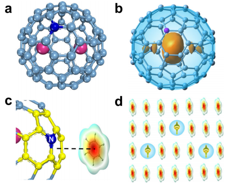 1. Y2@C79N的结构及自旋感知芳香族化合物取向示意图。